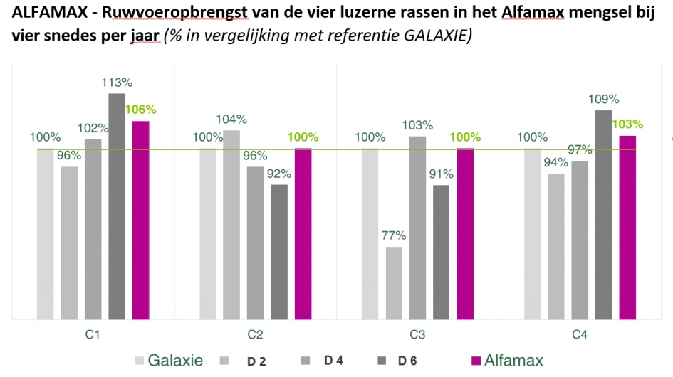 Een andere belangrijke ontwikkeling is het combineren van luzernerassen in mengsels. Ons moederbedrijf Cerience heeft hier de afgelopen jaren veel praktijkervaring mee opgedaan. Door rassen te mengen die elkaar aanvullen, wordt een hogere en stabielere opbrengst gerealiseerd dan met afzonderlijke rassen. Dit is duidelijk zichtbaar in het luzernemengsel AlfaMax, dat bestaat uit vier zorgvuldig geselecteerde rassen. In proeven presteert dit mengsel beter dan de afzonderlijke componenten